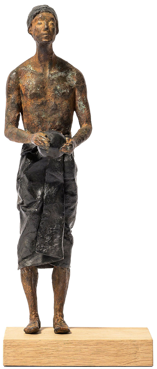Skulptur in feiner Bronze, patiniert, von Hand gegossen im Wachsausschmelzverfahren. Limitierte Auflage 75 Exemplare, nummeriert und signiert, mit Zertifikat. Format Skulptur mit Holzsockel 36,3 x 16 x 10 cm (H/B/T). Gewicht ca. 3 kg.