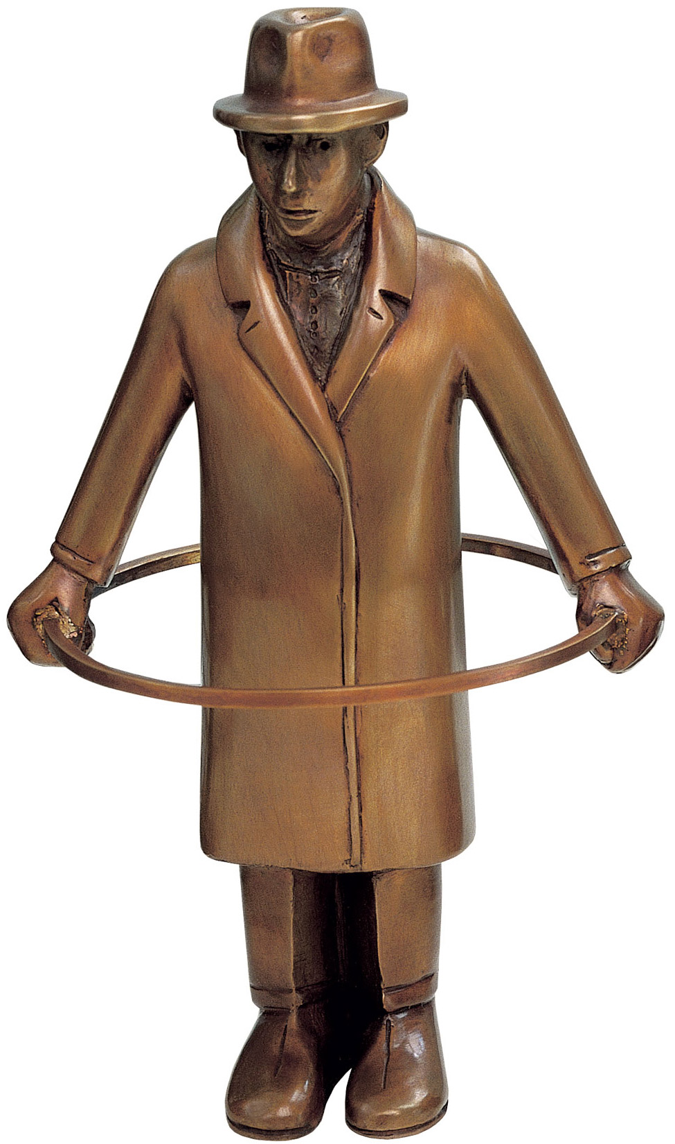 Der Reifen, Symbol der Mobilität, scheint hier eher eine Distanz zu beschreiben, die der Mensch zu seiner Umgebung wahren möchte. Signiert und nummeriert. Limitierte Weltauflage 498 Exemplare. Format 15,5 x 14 x 24,5 cm. Edition in feiner Bronze, von Hand gegossen im Wachsausschmelzverfahren. Limitierte Auflage 199 Exemplare.