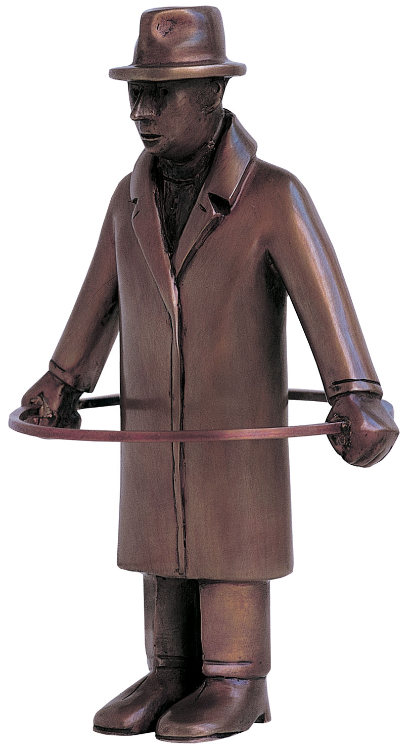 Der Reifen, Symbol der Mobilität, scheint hier eher eine Distanz zu beschreiben, die der Mensch zu seiner Umgebung wahren möchte. Signiert und nummeriert. Limitierte Weltauflage 498 Exemplare. Format 15,5 x 14 x 24,5 cm. Polymerer Kunstguss kombiniert mit Metallguss, von Hand gegossen, von Hand mit dunkler Eisenpatina überzogen. Limitierte Auflage 299 Exemplare.
