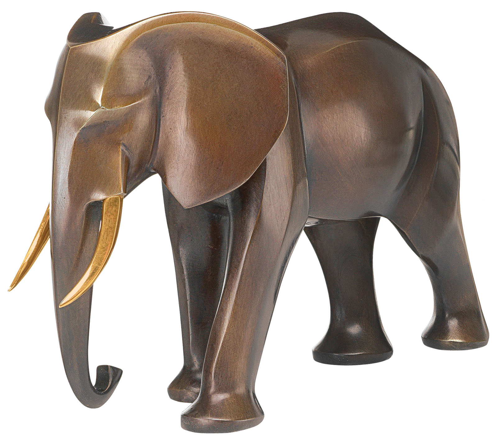 SIMES Elefanten-Skulptur zeichnet sich insbesondere durch ihre klare Form und ihre reduzierte Darstellungsweise aus. Der Künstler konzentriert sich ganz auf die wesentlichen Merkmale seines Motivs und abstrahiert dessen charakteristische Züge. Dabei bleibt immer die Natürlichkeit der Proportionen erhalten und die Skulptur strahlt Dynamik und Ästhetik aus.Edition in Bronze, gegossen im Wachsausschmelzverfahren, von Hand patiniert und poliert. Limitierte Auflage 499 Exemplare, nummeriert, signiert und mit dem Gießerei-Stempel punziert. Die Stoßzähne sind mit 24 Karat vergoldet. Format 14 x 23,5 x 9 cm (H/B/T). Gewicht 2 kg. ars mundi Exklusiv-Edition.