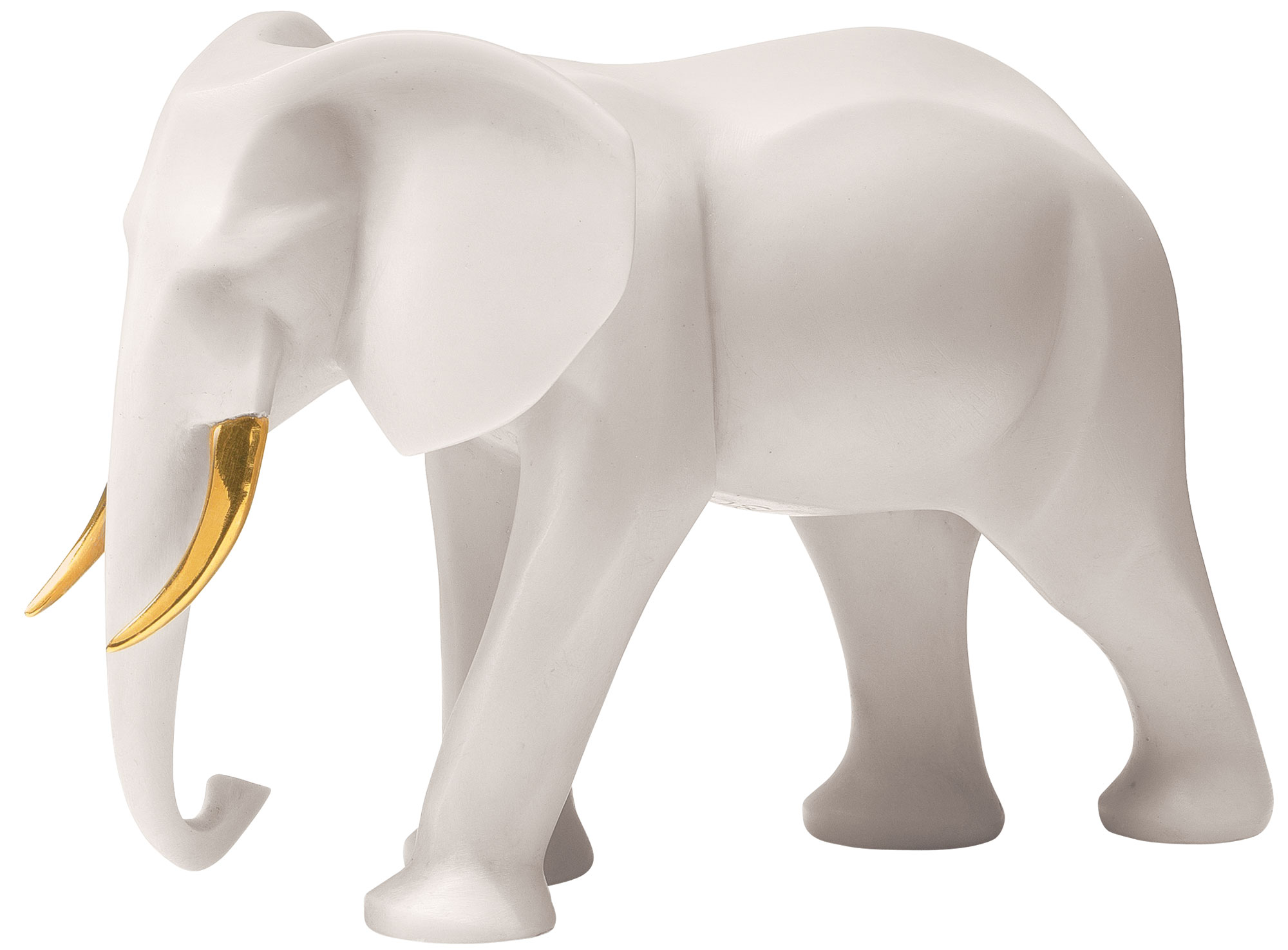 SIMES Elefanten-Skulptur zeichnet sich insbesondere durch ihre klare Form und ihre reduzierte Darstellungsweise aus. Der Künstler konzentriert sich ganz auf die wesentlichen Merkmale seines Motivs und abstrahiert dessen charakteristische Züge. Dabei bleibt immer die Natürlichkeit der Proportionen erhalten und die Skulptur strahlt Dynamik und Ästhetik aus.Edition in Kunstmarmor. Limitierte Auflage 499 Exemplare, nummeriert, signiert und mit dem Gießerei-Stempel punziert. Die Stoßzähne sind mit 24 Karat vergoldet. Format 14 x 23,5 x 9 cm (H/B/T). Gewicht 1,15 kg. ars mundi Exklusiv-Edition.