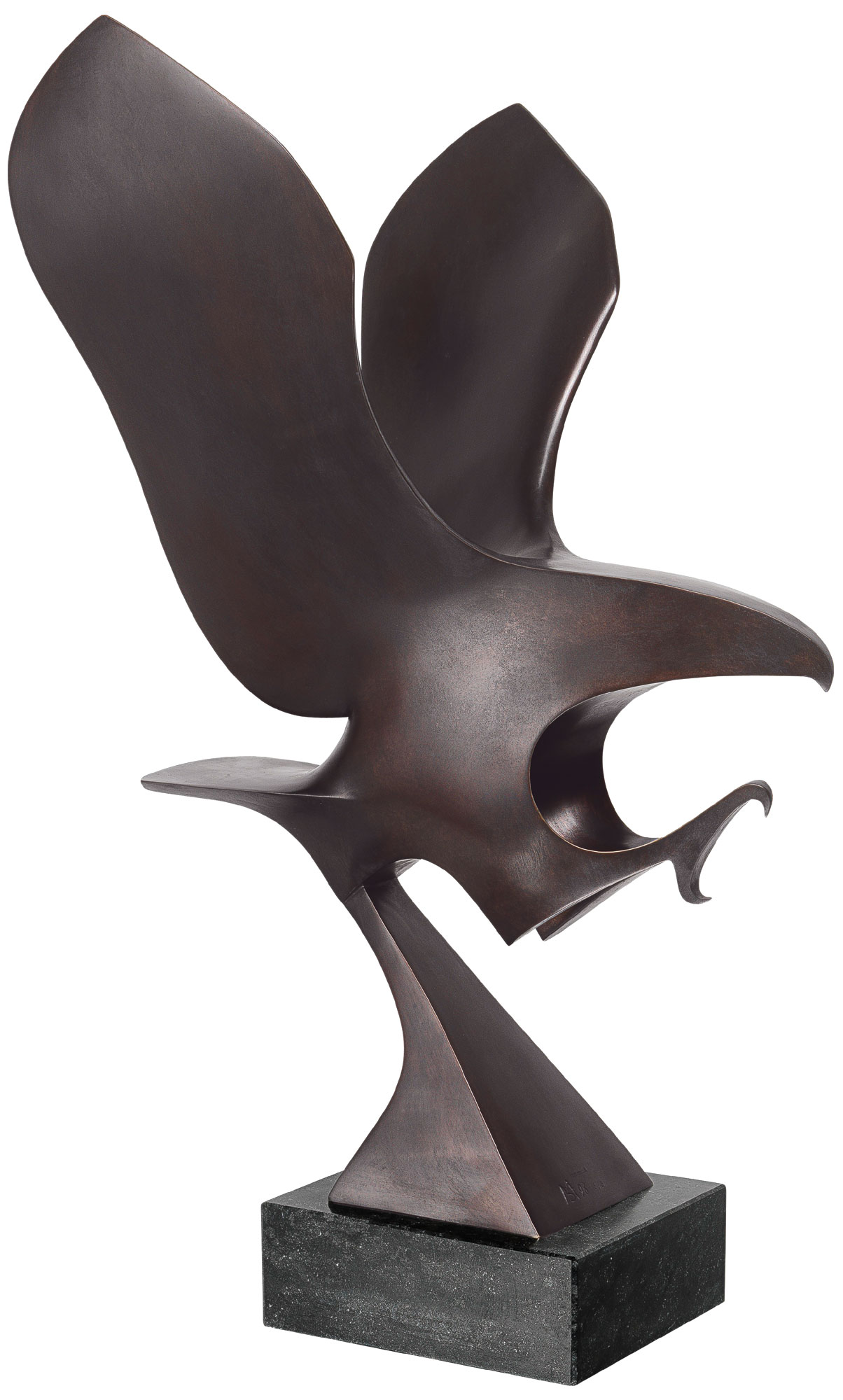 SIMES Adlerskulptur zeichnet sich insbesondere durch ihre klare Form und ihre reduzierte Darstellungsweise aus. Der Künstler konzentriert sich ganz auf die wesentlichen Merkmale seines Motivs und abstrahiert dessen charakteristischen Züge. Dabei bleibt immer die Natürlichkeit der Proportionen erhalten und die Skulptur strahlt Dynamik und Ästhetik aus. Skulptur in feiner Bronze, gegossen im Wachsausschmelzverfahren, von Hand patiniert und poliert. Limitierte Auflage 9 Exemplare, nummeriert, signiert und mit dem Gießerei-Stempel punziert. Format 25 x 56 x 38 cm (B/H/T). Gewicht 15 kg.