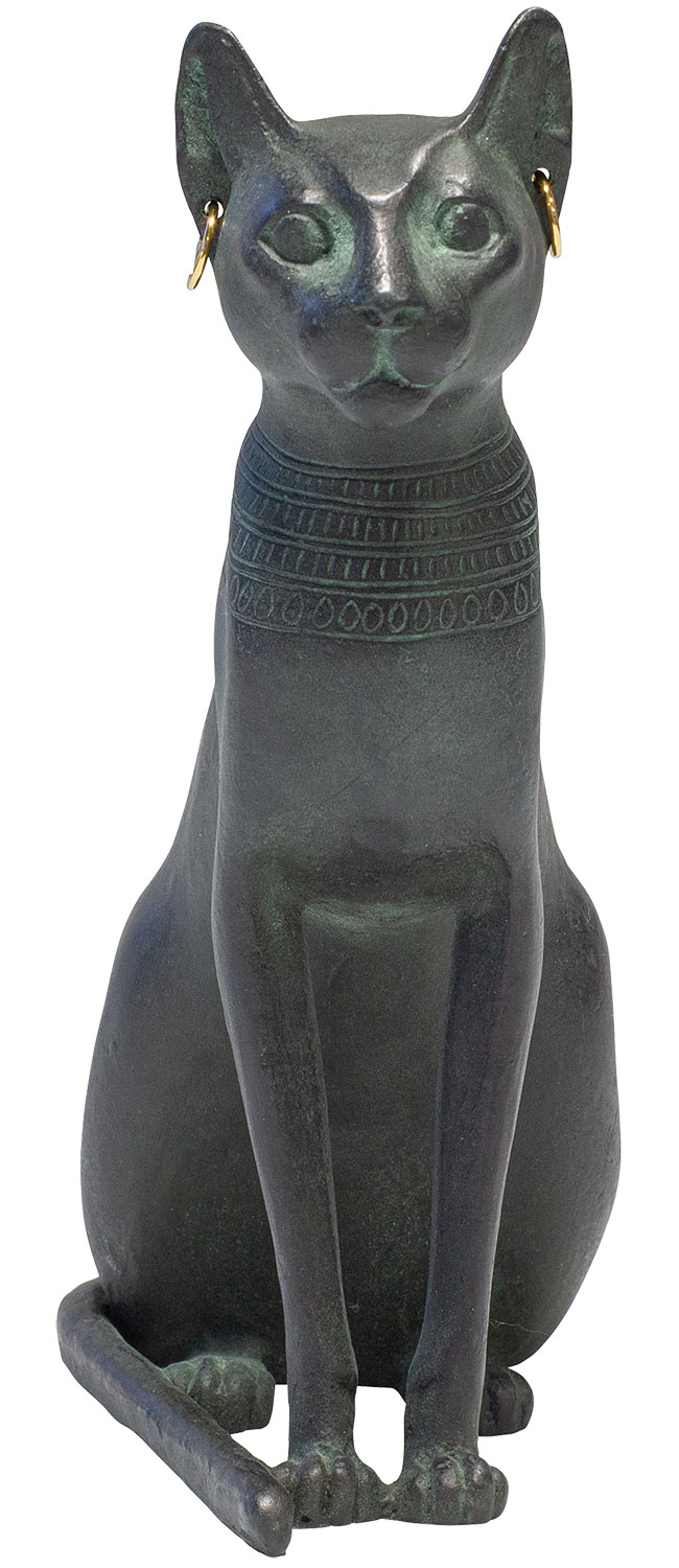 Samtpfotiges Symbol einer ägyptischen Göttin. Die Staatsgöttin Bastet stand bei den Pharaonen für die lebenserhaltende Kraft der Sonne und galt als Beschützerin der Menschen. Da sie dem Kult nach selber einen Katzenkopf trug, erkor sie eine Katze als ihr heiliges Tier. Original: Bronze, Ägypten, um 600 v. Chr., Musée du Louvre, Paris. Replikat in Bronze mit feiner Patinierung. Mit Authentizitätszertifikat. Format 18 x 7 x 13,5 cm (H/B/T). Gewicht ca. 1,2 kg.