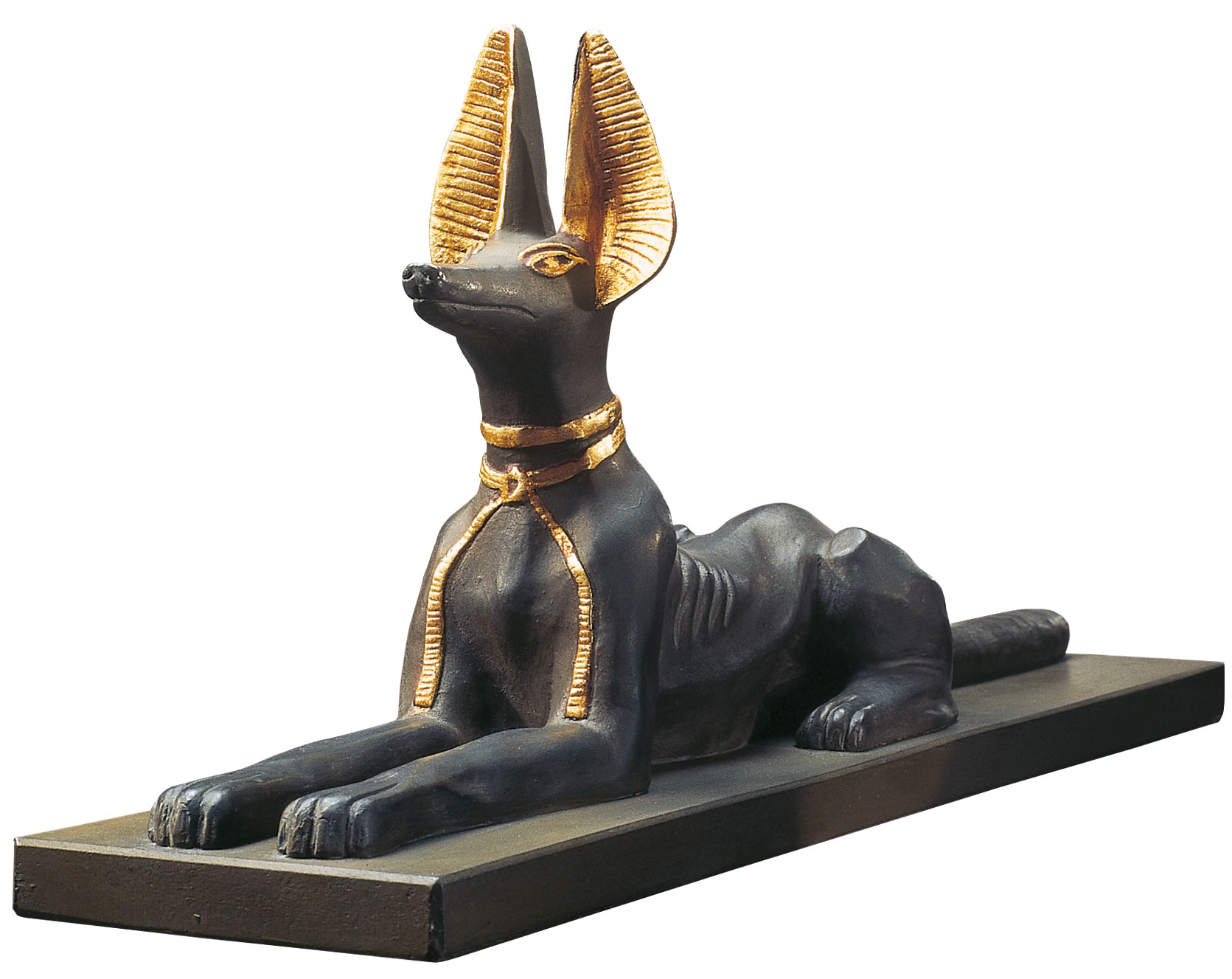 Er galt als Sohn des Osiris und der Schutzgöttin Nephthys und waltete als Seelenwäger beim Jenseitsgericht. In der 1922 von Howard Carter entdeckten 'Wohnung der Ewigkeit' des Tutanchamun stand er als 'Wächter und Hüter geheimer Dinge' am Eingang der unterirdischen Grabanlage auf einem vergoldeten Schrein. Original: Ägyptisches Museum, Kairo, Grabschatz des Tutanchamun. Neues Reich, 18. Dynastie, um 1335 v. Chr. Künstlermodell. Polymeres ars mundi Museums-Replikat, von Hand gegossen, teilweise vergoldet und fein patiniert. Format 52 x 12 x 23 cm.