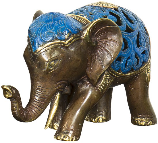 Bronze-Elefant von Hand gegossen, patiniert und zum Teil bemalt. Jedes Stück ein Unikat - Abweichungen in Größe, Form und Farbnuancen sind ein Zeichen für die handwerkliche Qualität. Format 11 x 11 x 17 cm (H/B/T). Blaue Version.