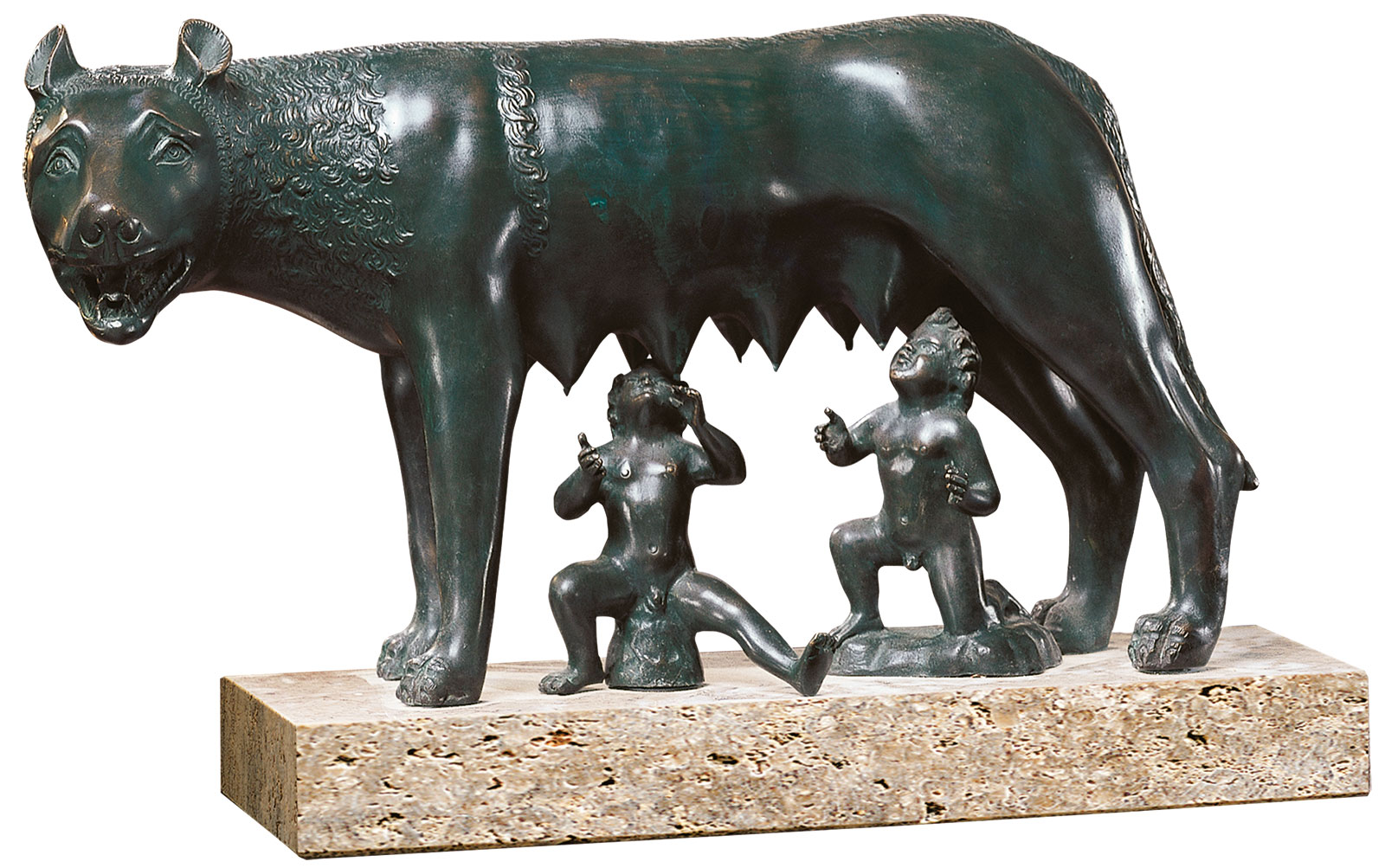 Die 'Lupa Capitolina' ist das Wahrzeichen Roms und das Symbol für Macht und Sicherheit - und steht bis heute für die faszinierende Geschichte des römischen Weltreiches. Der Legende nach wurden die Gründerväter Roms, die Zwillinge Romulus und Remus, als Kinder ausgesetzt und von einer Wölfin großgezogen. Stärke, Mut und Kämpferherz gab die Wölfin ihren Zöglingen mit. Die Skulpturengruppe stand auf dem Kapitol als Zeichen der Macht - und wurde 65 v. Chr. vom Blitz getroffen, wie Cicero überlieferte 'von den Göttern gezeichnet'. Original: Bronze, Palazzo dei Conservatori, Rom. 5. Jh. v. Chr. Fein patinierter Bronzeguss auf Muschelkalksockel. Reduktion. Format inkl. Sockel 43 x 25 x 13,5 cm. Gewicht 8,5 kg.