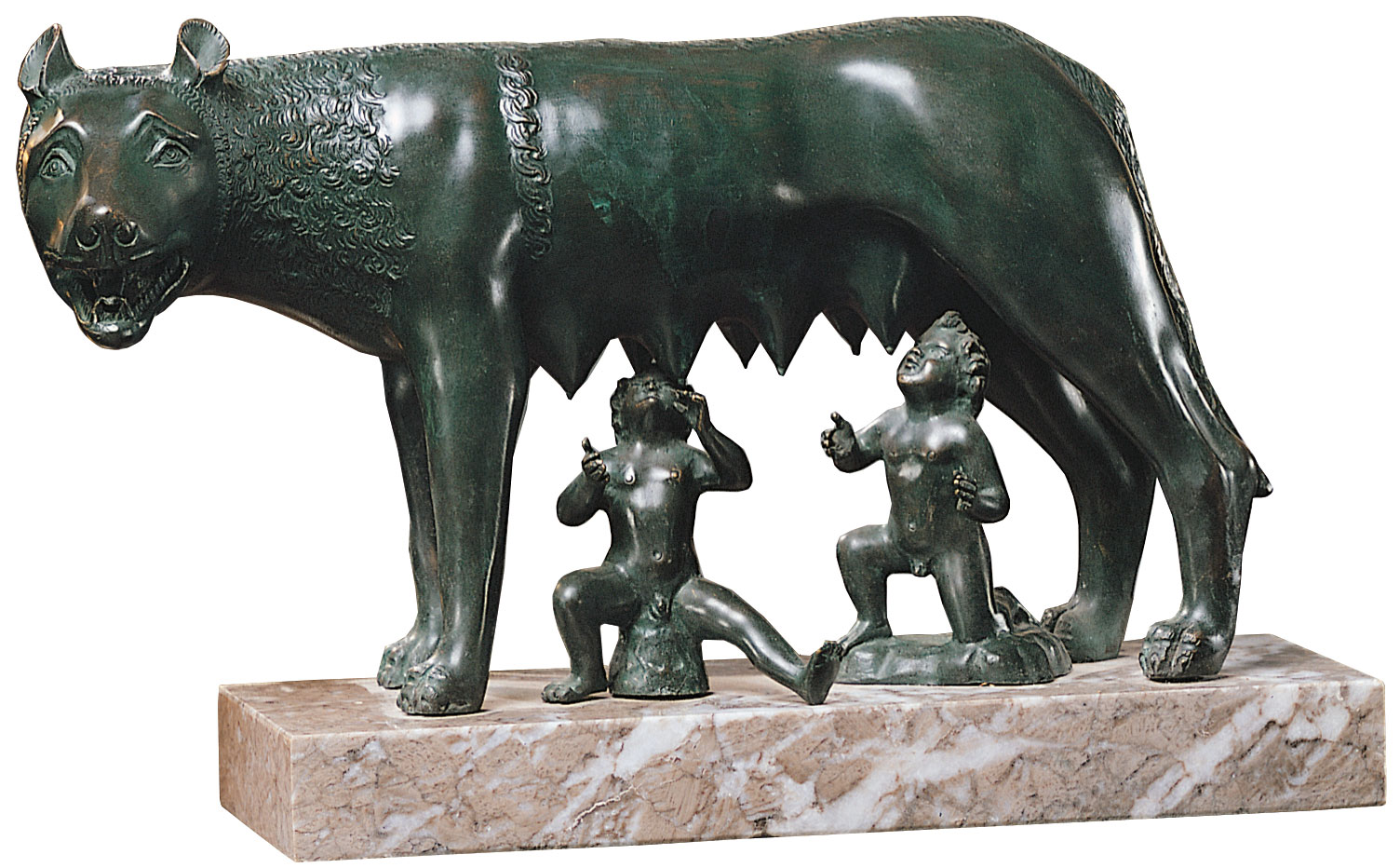 Die 'Lupa Capitolina' ist das Wahrzeichen Roms und das Symbol für Macht und Sicherheit - und steht bis heute für die faszinierende Geschichte des römischen Weltreiches. Der Legende nach wurden die Gründerväter Roms, die Zwillinge Romulus und Remus, als Kinder ausgesetzt und von einer Wölfin großgezogen. Stärke, Mut und Kämpferherz gab die Wölfin ihren Zöglingen mit. Die Skulpturengruppe stand auf dem Kapitol als Zeichen der Macht - und wurde 65 v. Chr. vom Blitz getroffen, wie Cicero überlieferte 'von den Göttern gezeichnet'. Original: Bronze, Palazzo dei Conservatori, Rom. 5. Jh. v. Chr. Polymerer Kunstguss mit bronzierter Oberfläche. Reduktion. Auf Muschelkalksockel. Format inkl. Sockel 43 x 25 x 13,5 cm.