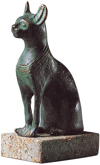 Diese hockende Katze mag als Votivgabe für die katzengestaltige Göttin Bastet gedient haben. Der Hauptkultort war Bubastis im Ostdelta. Der griechische Geschichtsschreiber hat ein lebhaftes Bild von Festen und Kultfeierlichkeiten übermittelt. Original: Ägyptisches Museum, Kairo. Spätzeit. Um 500 v. Chr. Fein patinierter Metallguss. Höhe mit Sockel 10 cm.