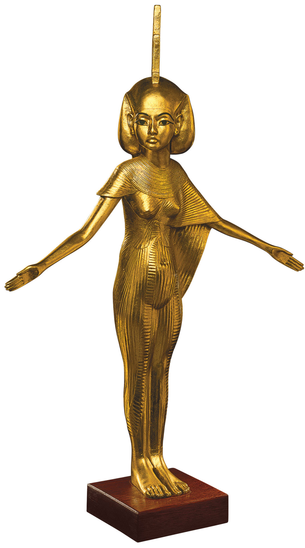 'Ich bin alles, was war, was ist und was sein wird...', so kennzeichnet eine Inschrift auf einem ihrer zahllosen Standbilder die 'Zauberreiche' und 'Göttin mit den 10.000 Namen'. Den Ägyptern war sie vor allem Mutter-, Frauen- und Geburtsgöttin. Sie galt als Göttermutter und Schutzgöttin des regierenden Pharao. Diese Figur war eine der vier Schutzgöttinnen, die den Schrein mit den Eingeweiden des mumifizierten Tutanchamun bewachten. Die Göttinnen sollten den Pharao im Jenseits beschützen und Gefahren von ihm abwehren. Der Schrein mit den Göttinnen wurde in einem Raum direkt neben der Sargkammer entdeckt. Ägypten, Neues Reich, 18. Dynastie, um 1335 v. Chr. Original: Ägyptisches Museum, Kairo, Schatz des Tutanchamun. ars mundi Bildhauermodell, von Hand gegossen und von Hand vergoldet. Originalgröße. Höhe inkl. Holzsockel 96,5 cm.