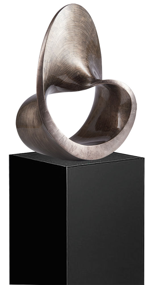 Das Designobjekt zeigt sich als zeitlose Kreation, welche ihre Ausdruckskraft aus Reduktion, Eleganz und innovativem Formenstil bezieht. Aus Resin, gemischt mit Holzfasern, handwerklich anspruchsvoll hergestellt. Skulptur: Format ca. 54 x 25 x 19 cm (H/B/T). Gewicht ca. 3,5 kg. Große Deko-Säule: Aus 12-mm-MDF, hochwertig lackiert, unsichtbare Kontaktfugen. Für den Innenbereich. Format 100 x 30 x 30 cm (H/B/T).Skulptur und Säule im Set.