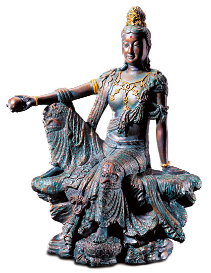 Die beliebte Göttin der beschützenden Liebe, dargestellt in der anmutigen 'Pose der königlichen Gelassenheit' (mahârâjalîla). Als Kastenzeichen ist ein feiner Rubin-Cabochon inkrustiert. In der Hand hält sie eine Lotosknospe als Symbol des Erbarmens, des Mitleids und der beschützenden Liebe. Ein Meisterwerk buddhistischer Bildhauerkunst: Das feine Gesicht, die kustvolle Frisur, das prächtige Gewand, die dekorative, um den Körper geschlungene Schärpe, jede Einzelheit ist auf das Sorgfältigste modelliert.Original: Victoria & Albert Museum, London.Komplett in Handarbeit geschaffenes Museums-Replikat. Reich ziselierter polymerer Bronze-Kunstguss mit Schmuck-Applikationen mit 24 Karat Blattgold aufgelegt. Format (B/H/T) 37,5 x 52 x 25,5 cm. Gewicht ca. 17 kg.