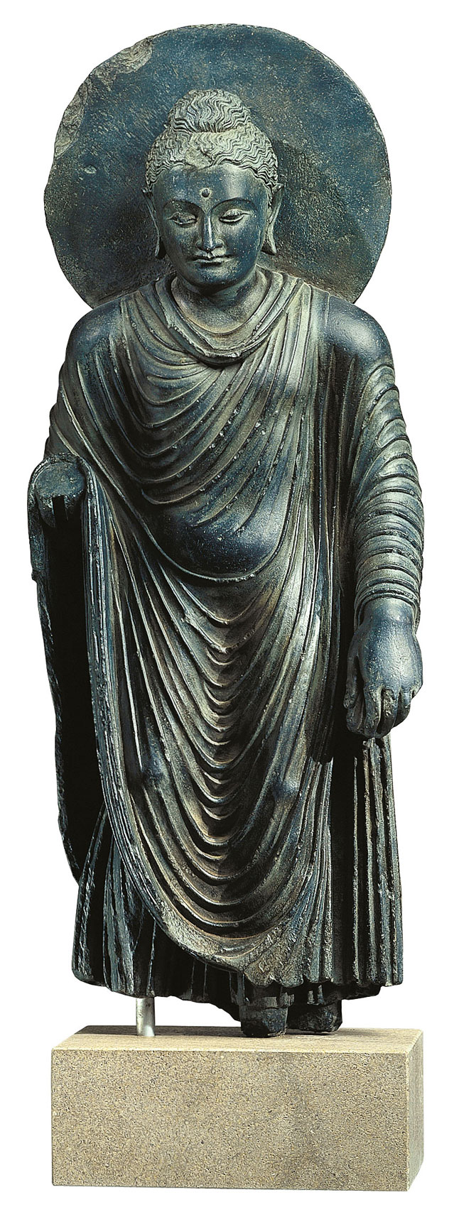 Diese zur Anbetung und Verehrung geschaffene Kultstatue stammt aus einem der Hauptzentren der frühen buddhistischen Steinfiguren. Sie zeigt den vergöttlichten Weltüberwinder in vollkommener geistiger Konzentration. Original: Staatliche Museen zu Berlin - Preußischer Kulturbesitz, Museum für Indische Kunst. Takht-i-Bâhi, Gandhara, 2./3. Jahrhundert, Stein. Polymeres ars mundi Museums-Replikat von Hand gegossen, Höhe inkl. Sockel 112 cm. Gewicht ca. 50 kg.