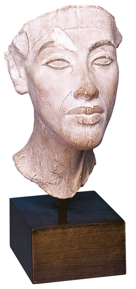När Akhenatens "solstad" upptäcktes i Tell el-Amarna 1912, upptäcktes denna imponerande byst av faraon i Thutmoses verkstad. Original: Staatliche Museen zu Berlin - Preußischer Kulturbesitz. Nya riket, 18:e dynastin, ca 1345 f.Kr. Polymer ars mundi museum replika gjuten och målad för hand. Höjd med bas 35,5 cm.