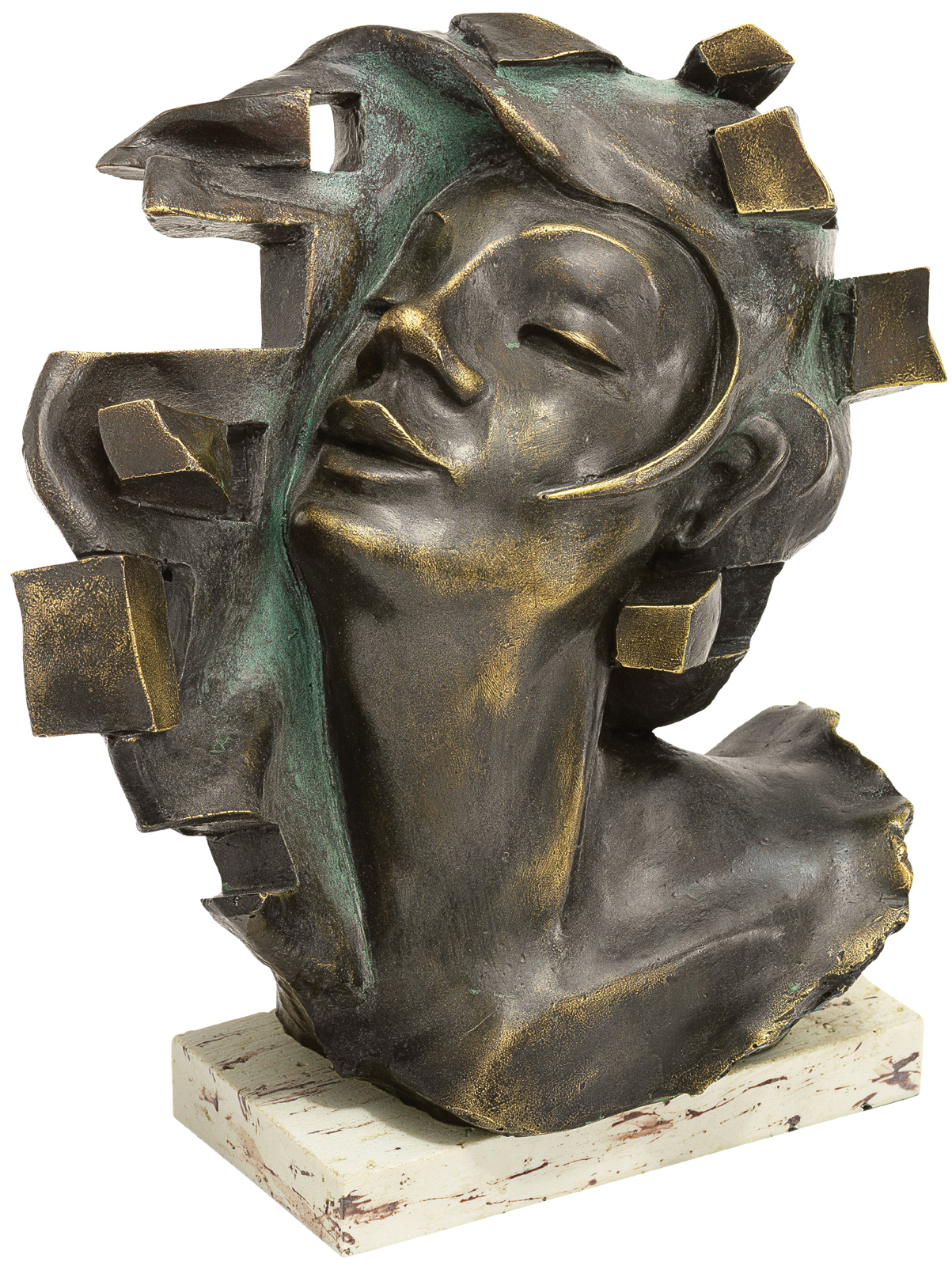 Lyckans och sensualitetens andedräkt, avbildad av konstnären Andreas Gomez i form av ett kvinnoansikte. Skulptur av bronsbelagd konstmarmor på en bas av grafit. Storlek 28 x 26 x 11 cm (H/W/D). Vikt ca 3,3 kg.
