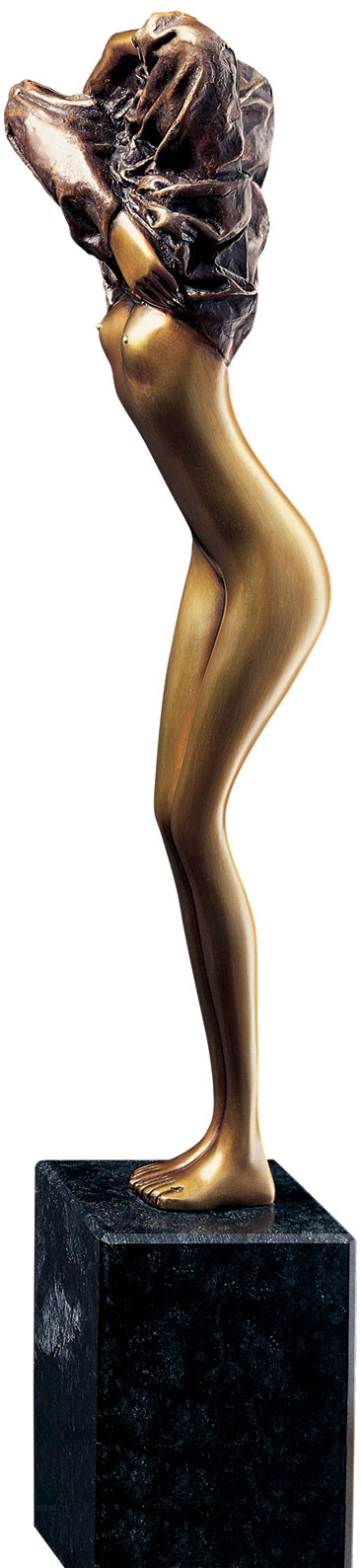 En kvinna med en mantel dragen över huvudet: ett centralt motiv av Bruni, som han fulländade i många variationer. Skulptur i fin brons, patinerad, delvis polerad. Gjuten för hand i tekniken med förlorat vax. Monterad på en bas av naturlig diabassten. Skulpturens höjd 40 cm, totalhöjd inklusive sockel 49 cm. Vikt ca 4 kg. Upplaga 1.250 exemplar, numrerade och signerade.