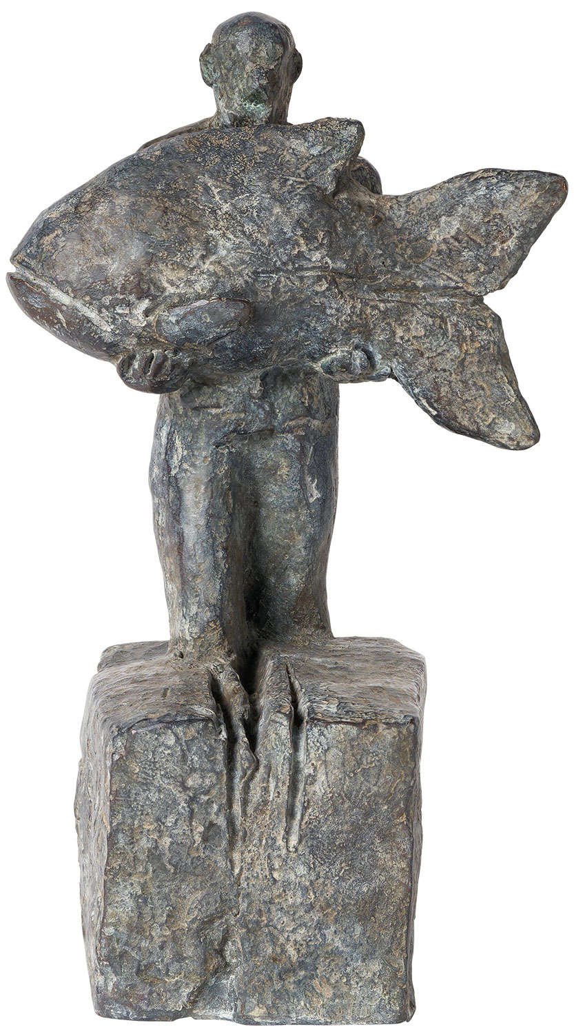 Christoph Fischers "hoppfulla" har redan nått fast mark igen och vadar i land. Och han bär på en överdimensionerad fisk - en lyckosam fångst, en lyckad dag. Och även: uppfyllandet av ett hopp. Skulptur i fin brons, gjuten med tekniken för förlorat vax, mejslad för hand och gråpatinerad. Hämtad direkt från originalet. Begränsad upplaga om 199 exemplar, numrerad, monogrammärkt och stämplad med gjuteriets och ars mundis stämpel. Med numrerat äkthetscertifikat och begränsningscertifikat. Format ca 16,5 x 5,5 x 9,5 cm (h/w/d). Vikt ca 1,7 kg. ars mundi exclusive edition.