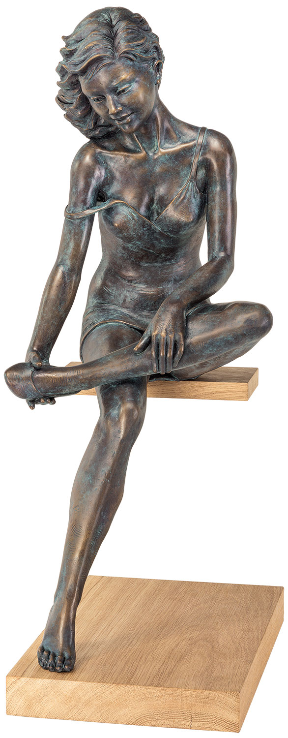 Den italienske skulptören Damiano Taurino kommer från Salento-halvön - en region där barockens konst och arkitektur är allestädes närvarande. Detta inflytande känns fortfarande igen i Taurinos figurer. Realistiskt och med stor omsorg om detaljerna modellerar han sina skulpturer, som i själva verket är scener och berättar sina egna små historier.den unga kvinnan som avbildas glider också av sig dagens ansträngningar med sin sko. Hon är kanske ingen dansare, men även här är hållningen inte mindre elegant och även här kommer skönheten från rörelsen.edition i brons, gjuten med tekniken för förlorat vax, mejslad och patinerad för hand. Begränsad upplaga om 12 exemplar, numrerad och signerad. Format 73 x 26 x 36 cm (H/W/D). Vikt 17,9 kg.