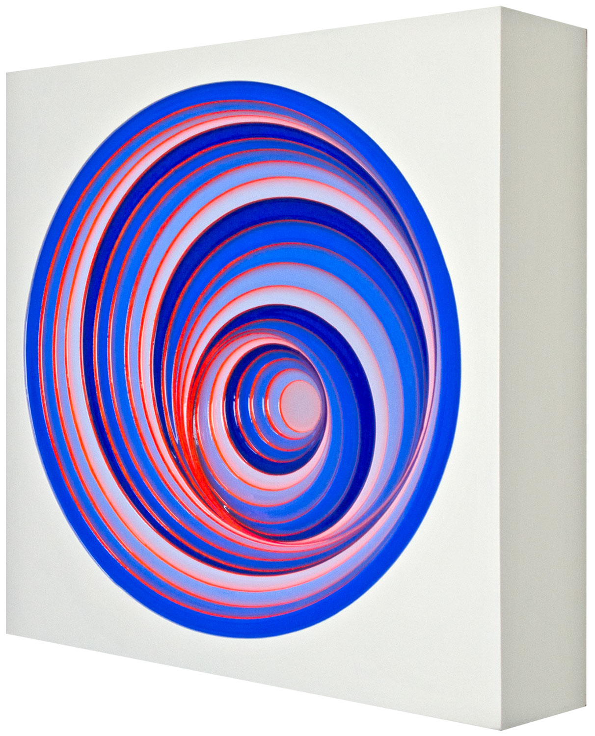 Väggobjekt av trä, akrylfärg och epoxiharts. Handsignerat på baksidan. Storlek 52 x 52 x 10 cm (H/W/D). Vikt ca 2 kg. Med upphängningsanordning.