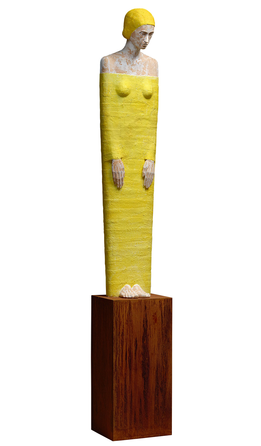 Huvudet lätt nedåtböjt, vilande och introspektivt: i sin skulptur "Ruhende" betonar Perathoner utsikten in i det innersta genom en reducering av formen. Skulptur av schweiziskt furuträ inlindad i gipsbandage och färglagd med akrylfärg. Inklusive järnbas. Signerad. Figurens höjd 124 cm. Höjd på sockel 60 cm. Total höjd 184 cm. Vikt 21 kg.
