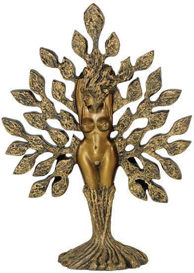 "Livets träd" av Fuchs och Askew Det var en förfrågan till Ernst Fuchs som utlöste skapandet av "Livets träd": Ursprungligen skulle skulpturen fungera som en utmärkelse för människor runt om i världen som har gjort enastående insatser för att bevara skogsområden. När de första skisserna till slut var klara avbokade kunden sitt uppdrag. Fuchs bestämde sig ändå för att slutföra konstverket och bad Askew om hjälp med att förverkliga det. I slutändan flödade så många gemensamma idéer in i skulpturen att den nu betraktas som ett gemensamt verk. I "Livets träd" kombineras ekologiska idéer med de mytologiskt-fantastiska motiv som är så typiska för båda konstnärerna. Den ursprungliga symbolen för fruktbarhet och livets överflöd förekommer redan i den forntida orientaliska konsten och genomsyrar konsthistorien under hela antiken. Den är till och med ett vanligt förekommande motiv i indisk konst. Som en symbol som hyllar livet (och i den kristna tolkningen sedan medeltiden också: uppståndelsen) har den fascinerat konstnärer i alla tider - även moderna, tänk bara på Klimts berömda förverkligande i Stoclet-frisen. Fuchs och Askew förblir figurativt konkreta i sitt Livets träd: en kvinnlig torso växer ut ur stammen som en symbol för det moderliga, livgivande, omgiven av ett rikt lövverk.ars mundi exclusive edition i tre versioner: Version som marmoravgjutning med guldmålning, gjuten för hand. Begränsad upplaga om 999 exemplar, numrerad och signerad. Storlek 30 x 42 x 11 cm (B/H/D). Vikt 2,2 kg.