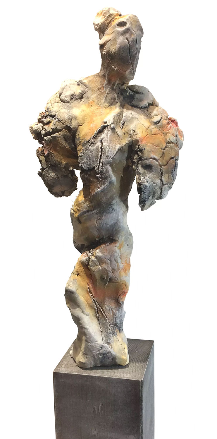 Skulptur av keramik och lera. Färdigbehandlad med kall patina. Signerad för hand. Storlek inkl. träfot 53 x 18 x 10 cm (H/W/D). Vikt ca 2,7 kg.