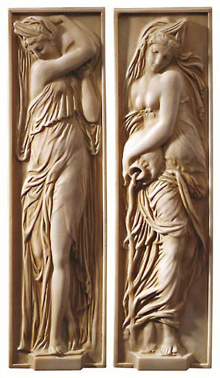 Den parisiska "De oskyldigas fontän", ett mästerverk från renässansen! Rikt dekorerad med reliefer av den franske skulptören Jean Goujon. Dessa förminskningar av "vattenbärarna" är fängslande vackra i sin elegans och grace. Original: Musée des Monuments Français, Paris. Polymer ars mundi museum replika, gjuten för hand. De är en makalös prydnad för varje vägg. Storlek 11,5 x 45,5 cm. Baksida med inbäddad hängare.