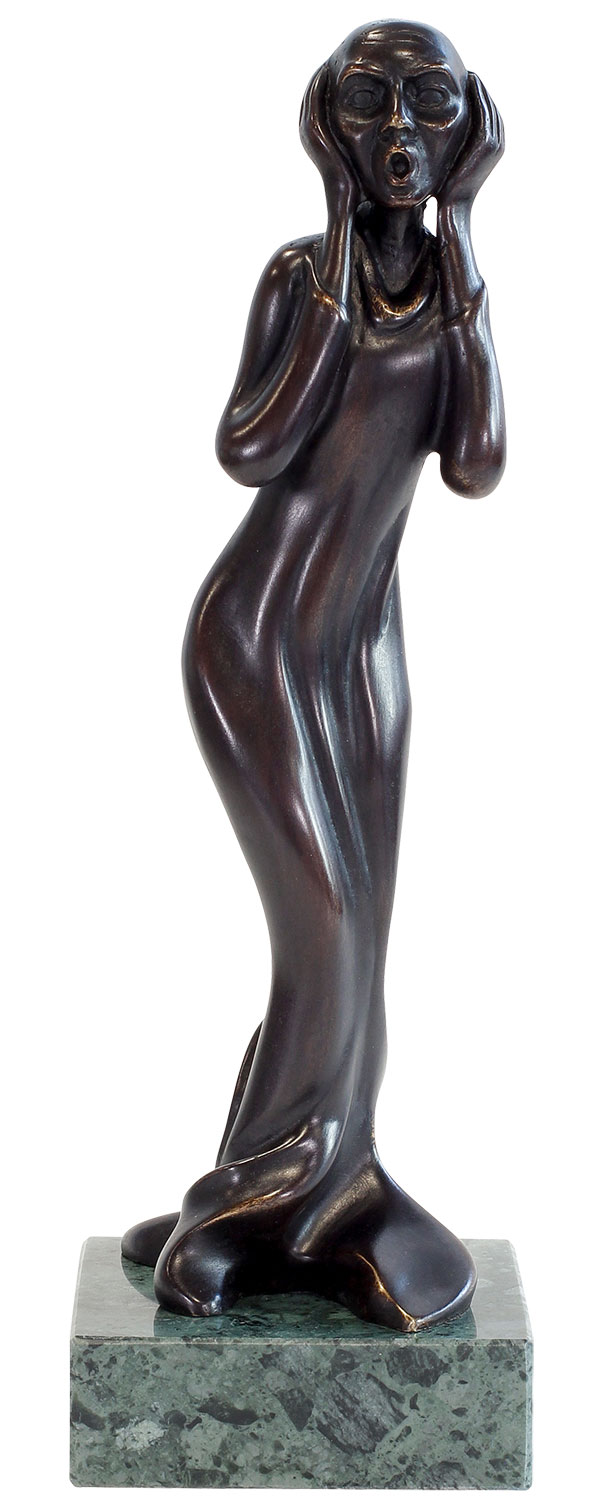 Skulptören Jochen Bauer har utfört Edvard Munchs berömda motiv exklusivt för ars mundi som en kärleksfull skulptörmodell. Begränsad upplaga om 980 exemplar, numrerad. Utförande i brons, patinerad, på en bas av diabas. Storlek 30 x 9 x 9 cm (h/w/d). Vikt ca 3 kg.