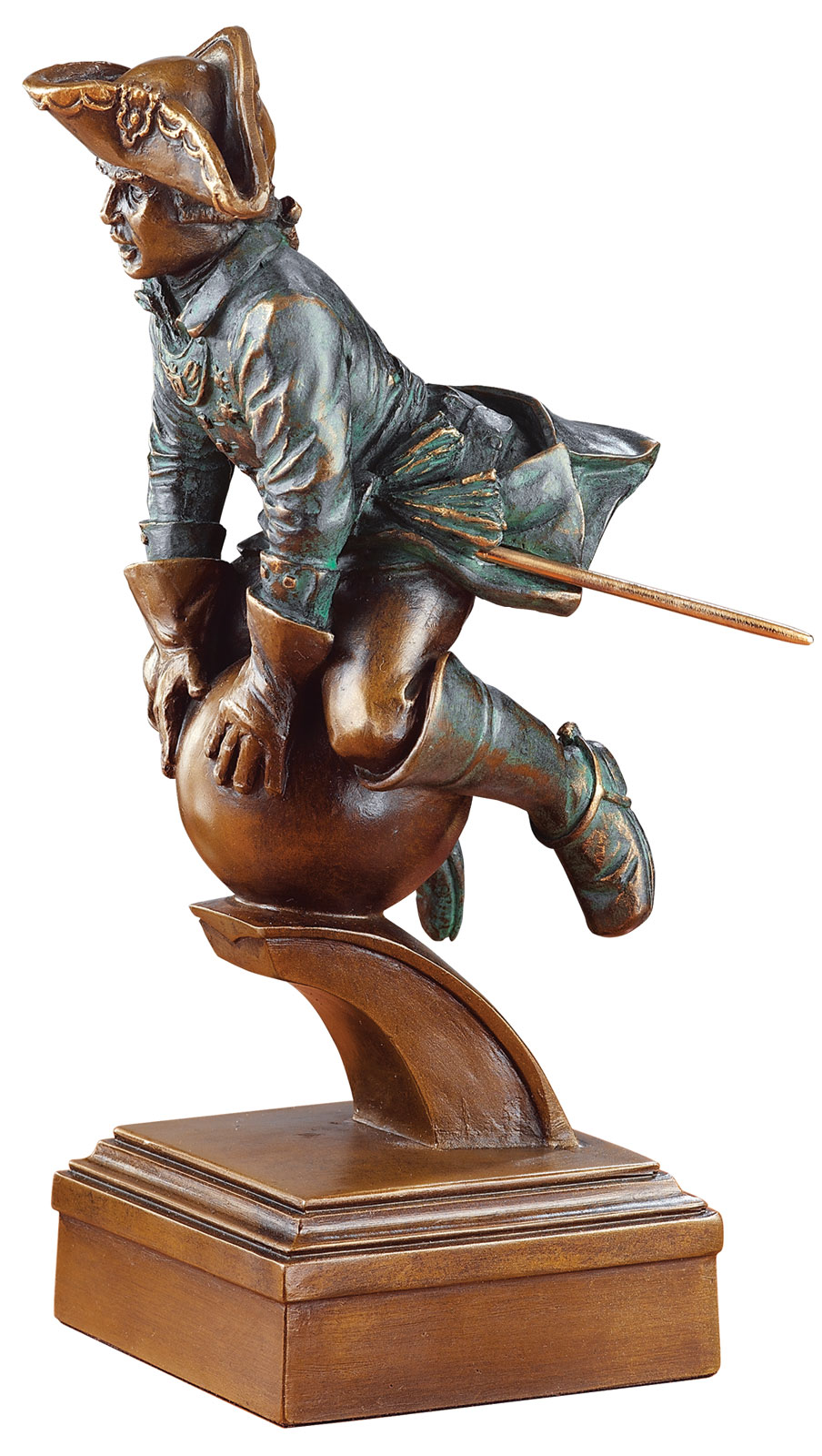 "Av rent mod och tjänstvillighet, och faktiskt lite förhastat, ställde jag mig bredvid en av våra största kanoner som sköt in över staden, och när den avfyrades igen hoppade jag på kulan som susade ut ur pipan! Jag ville flyga in i fästningen tillsammans med kulan! Men mina tvivel växte under den svischande flygningen. Du kommer lätt in, tänkte jag, men hur ska du ta dig ut igen? De kommer att känna igen dig som en fiende i din uniform och hänga dig i närmaste galge! Dessa tankar gjorde mig mycket illa till mods. Och när en turkisk kanonkula riktad mot vårt läger flög förbi mig, svängde jag mig över den och kom tillbaka till mina husarer välbehållen, om än utan att ha åstadkommit någonting."Hieronymus Carl Friedrich Freiherr von Münchhausen föddes på sin fars gods i Bodenwerder den 11 maj 1720. Efter utbildning och en karriär som officer i tsarinnan Katarina den stores tjänst återvände han 1750 för att förvalta sitt gods. Redan under sin livstid hyllades han som en briljant och humoristisk historieberättare. "Baron von Münchhausen" brukade berätta för sina vänner om sina resor och de krig han faktiskt hade deltagit i över en god flaska - fantastiska historier och underhållande äventyr till lands och till sjöss. Och naturligtvis ljög de så mycket de kunde ... Mästerkatten i stövlar, Hans i lyckan, baron von Münchhausen ... och vad de nu alla heter: sedan barndomen, när vi först hörde sagorna och berättelserna, har var och en av oss haft en exakt bild av dessa karaktärer i våra sinnen. Konstnärer är inte annorlunda - inte ens de skulptörer som har fått i uppdrag av oss att skapa sin version av dessa barndomskamrater. Vi har de noggrant utformade modellerna av deras barndomsfantasier noggrant gjutna - dessa skulpturmodeller finns exklusivt tillgängliga från ars mundi. Skulptur i polymer konstgjutning med bronserad yta. Storlek 9 x 23,5 x 10,5 cm (B/H/D). Vikt 1150 g.
