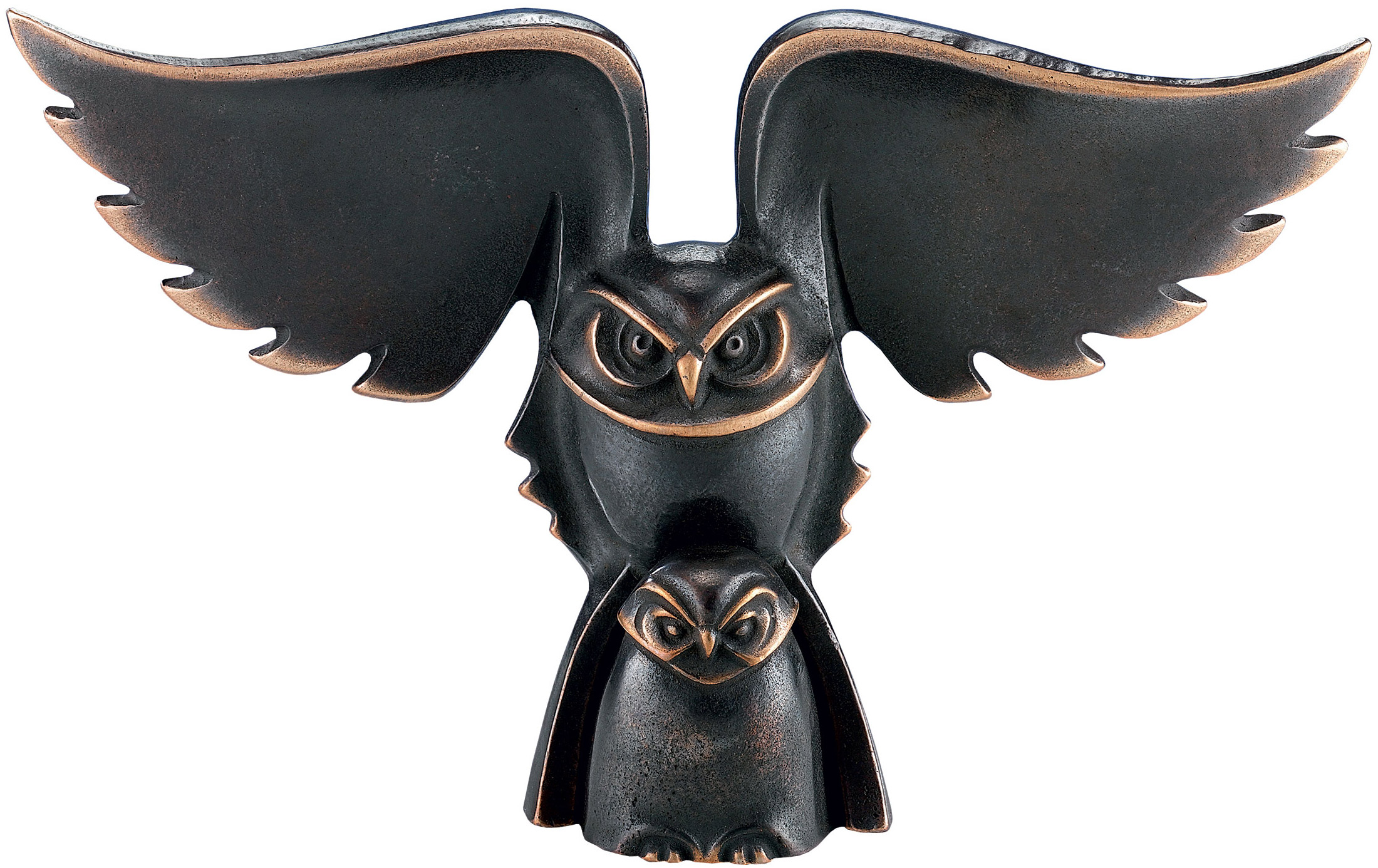 Jochen Bauers vishetsfågel imponerar med sin moderna betoning på klara linjer och former och är en delikat symbol för moderlig omsorg. Skulptur i två delar, tillverkad i fin brons, storlek 19 x 11 cm (stor uggla) och 3,5 x 5 cm (liten uggla).