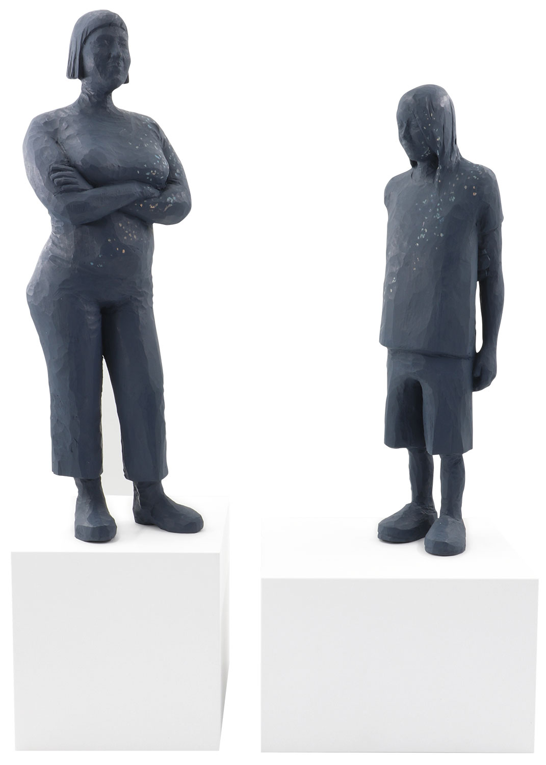 Handgjorda skulpturer av lindträ, målade med akrylfärg, flera lager delvis exponerade. Var och en på en vitlackerad MDF-bas för väggmontering. Begränsad upplaga om 4 exemplar. Storlek på kvinnan med sockel ca 46,5 x 13 x 15 cm (h/w/d). Storlek på pojken med sockel ca 42 x 17,5 x 15 cm (h/w/d). Vikt ca 1,2 kg vardera. båda skulpturerna i set.
