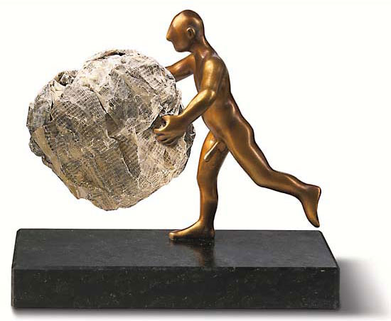 "Hermes" meddelanden med en skillnad: gudarnas budbärare från den klassiska antiken levererar dagens nyheter i form av en boll av tidningspapper. Tamar lyckas symbolisera vår alltför flyktiga medievärld på ett underbart humoristiskt sätt. Höjd inkl. bas av diabas 17,5 cm. Basens storlek 20 x 3 x 8,5 cm (B/H/D). Edition i fin brons. Begränsad upplaga om 99 exemplar, gjutna för hand med tekniken förlorat vax. Signerad och numrerad.