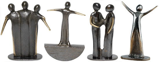 Dessa graciösa små bronser kännetecknas av flödande, eleganta former och hög symbolisk kraft. De är gjutna i fin brons med hjälp av tekniken för förlorat vax och patinerade och polerade för hand. "Cohesion": Format 7 x 6 x 2,5 cm (H/W/D). "Balance": Format 7 x 4,5 x 1 cm (H/W/D). "Tack": Format 7 x 4 x 2,5 cm (H/W/D). "Joy": Format 7,3 x 5 x 2,8 cm (H/W/D) Skulpturerna "Cohesion", "Balance", "Thanks" och "Joy" i en uppsättning.