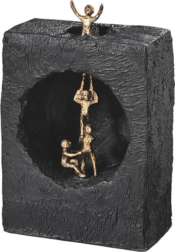 Budskap från vardagen, kärleksfullt tillspetsade: med en medveten kontrast mellan den guldskimrande polerade bronsen och den svartfärgade konststenen ger den utbildade guldsmeden Kerstin Stark sina bordsskulpturer en speciell lyskraft: ingen kan komma på det ensam, tillsammans är det en barnlek! Format 12,5 x 19 x 6,5 cm (B/H/D).