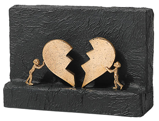 "Ett hjärta som kan repareras". Så lyder den lyckliga slutsatsen i en sång av Udo Lindenberg. Skulptur för hjärtefrågor. Känslomässig symbolik i polerad brons på svart konststenssockel. Storlek 19,5 x 13,5 x 7 cm (B/H/D).