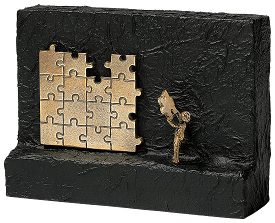 Vackert att ge: Kerstin Stark vill med sina skulpturer förmedla budskap från vardagslivet. Den utbildade guldsmeden kombinerar och kontrasterar ädla material. Genom enkelhet skapar hon en intim atmosfär med gott om utrymme för personlig utveckling. Detta är den sista byggstenen - den sista pusselbiten - till konstverket. Bordsskulptur av finpolerad brons på en bas av konststen. Storlek 19 x 14,5 x 6 cm (B/H/D). Vikt ca 2,5 kg.
