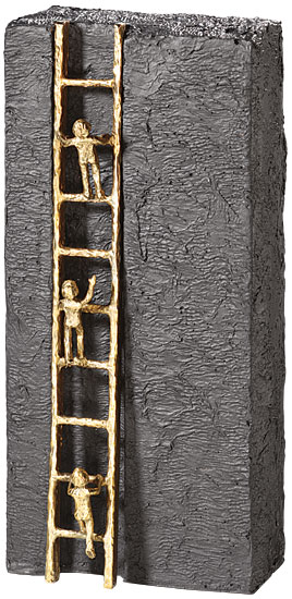 Med sin reducerade och kontrastrika formgivning var Kerstin Stark en representant för en ung generation konstnärer som med sina bronsskulpturer förmedlade vardagens budskap. Kerstin Stark kontrasterar medvetet den finpolerade bronsen mot den svartfärgade konststenssockeln och ger sina huvudpersoner en särskild lyskraft.Vägen upp för karriärstegen är brant, trappstegen inte alltid lätta att klättra upp för. Alla står ensamma på stegen. Och vem vet vad som väntar dem på toppen... Bordsskulptur i polerad brons med bas i gjuten sten. Höjd 24,5 cm, bredd 11,5 cm, djup 8 cm.