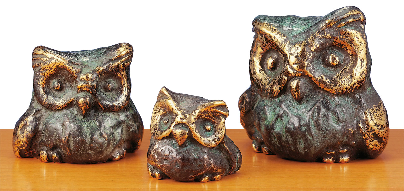 Klaus Albert, född 1925 i Köln, har modellerat sin söta uggletrio med en gnutta humor och lekfull lätthet. 3-delad ensemble i fin gunmetalbrons, gjuten med sandgjutningsprocessen, patinerad och polerad för hand. Väderbeständig. Skulpturernas höjd 5, 7 och 8 cm.