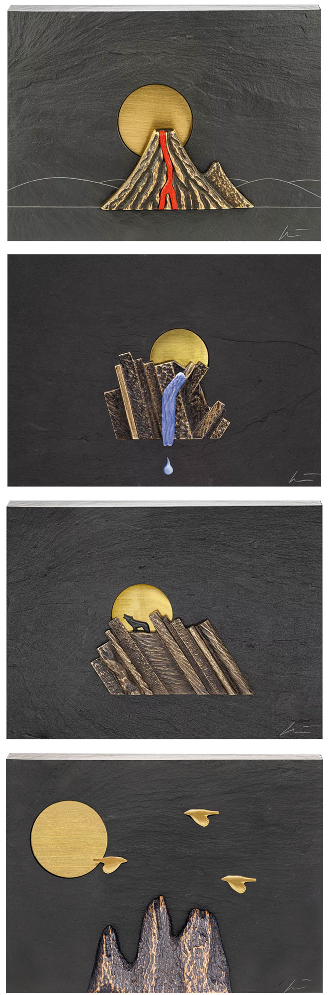 4 väggobjekt av skiffer med brons och mässing, delvis infärgade. WVZ nr 490-493, varje objekt är unikt, signerat av konstnären. Format vardera 15 x 20 x 2,5 cm (h/w/d). Med upphängningsanordning. "Eld", "Vatten", "Jord" och "Luft" i en uppsättning.
