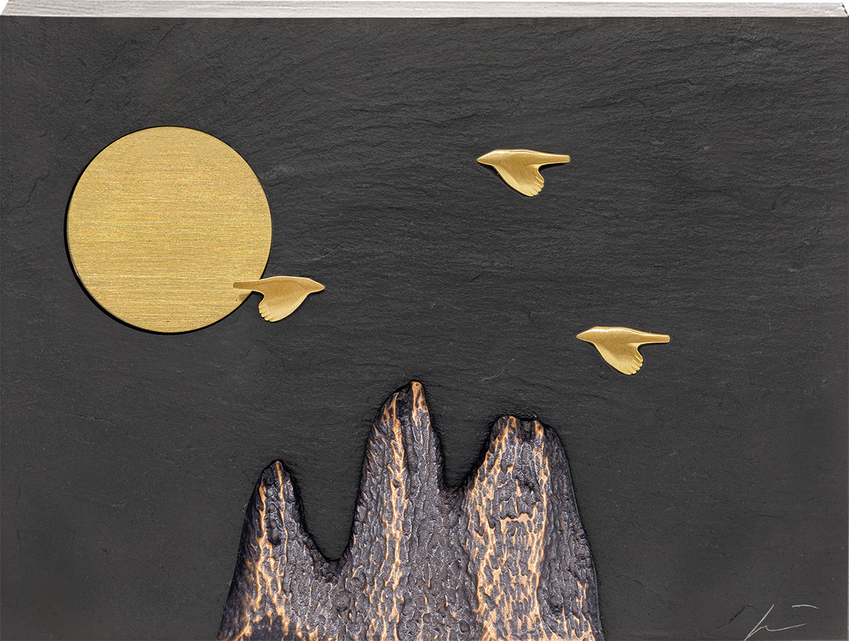 Väggobjekt av skiffer med brons och mässing. WVZ nr 493, varje objekt är unikt, signerat av konstnären. Storlek 15 x 20 cm (H/B). Med upphängningsanordning.
