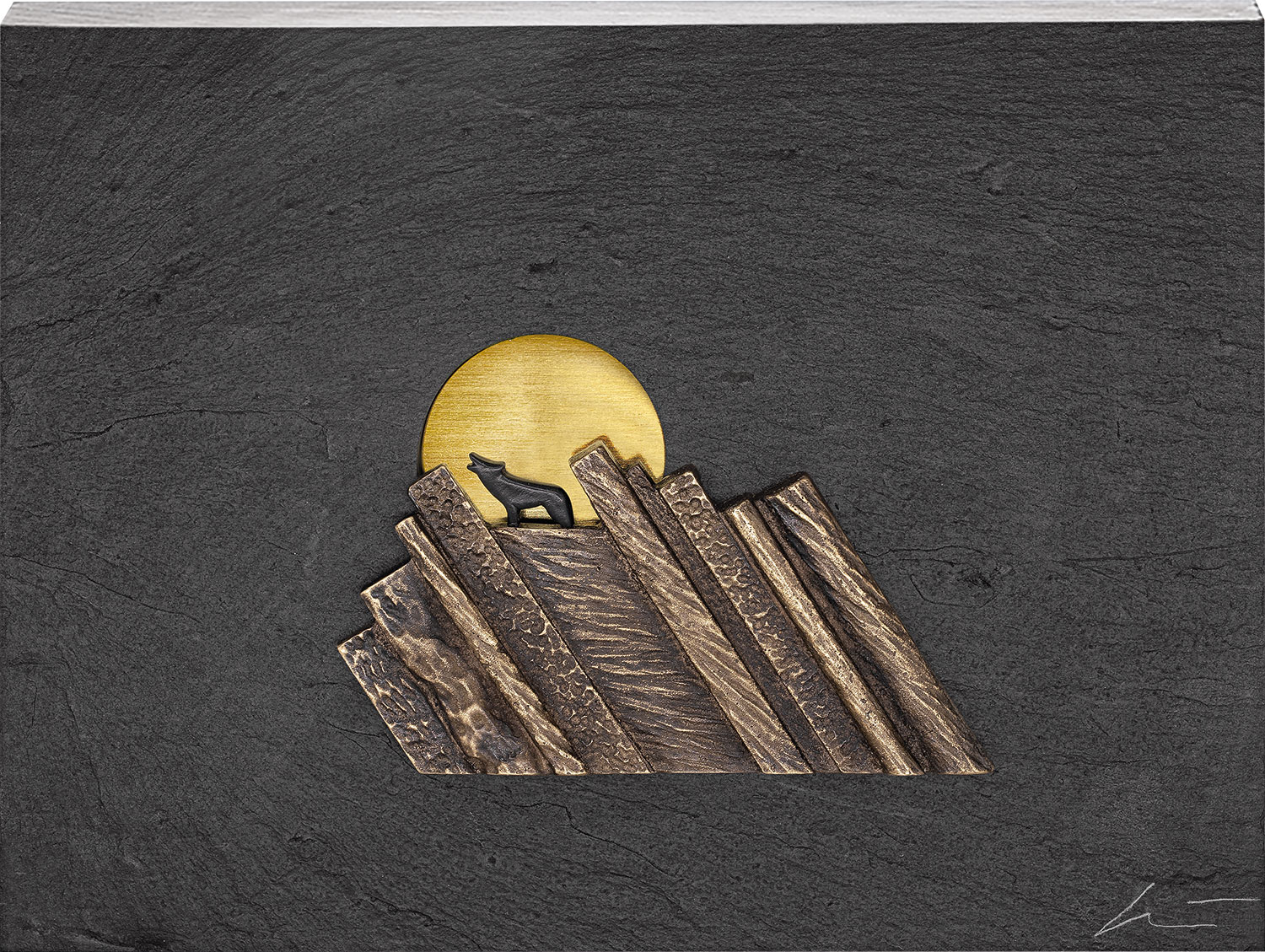 Väggobjekt av skiffer med brons och mässing. WVZ nr 491, varje objekt är unikt, signerat av konstnären. Storlek 15 x 20 cm (H/B). Med upphängningsanordning.