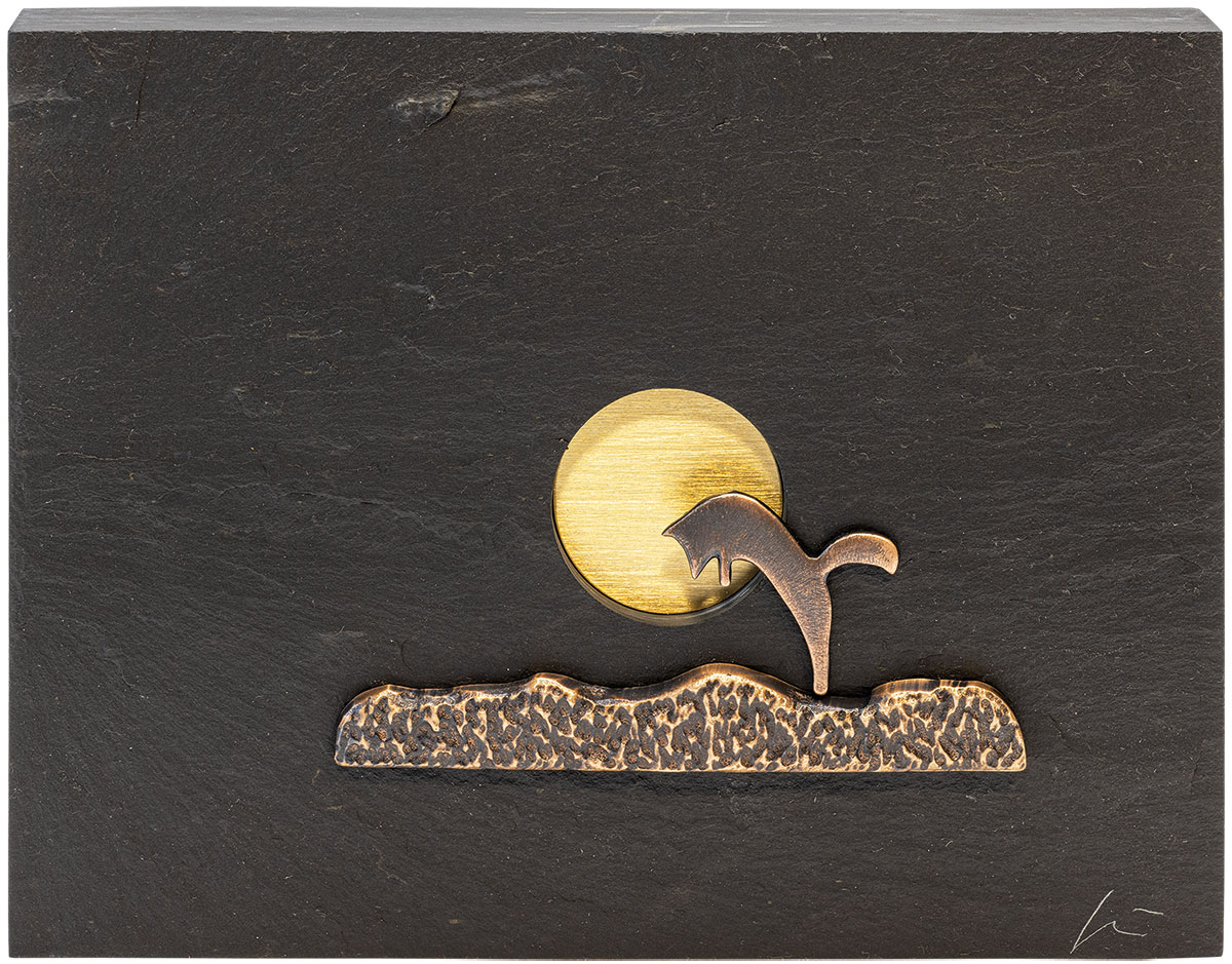Väggobjekt av skiffer med brons och mässing. WVZ nr 496, varje objekt är unikt, signerat av konstnären. Storlek 15 x 20 cm (H/B). Med upphängningsanordning.