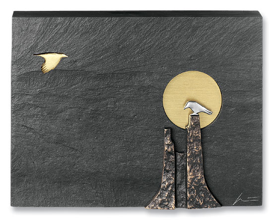 Väggobjekt av skiffer och brons. Unikt exemplar, signerat av konstnären. Format 20 x 15 cm. Med upphängningsanordning. Raisonné-katalogen nr 436.