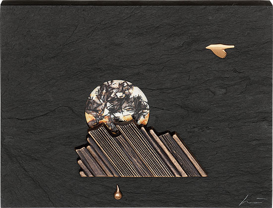 I serien Apenninerna bearbetar Börner intrycken från sina resor och vandringar genom den centralitalienska bergskedjan. Väggobjekt av skiffer och patinerad brons. Sol av brons, polykromad i fältspatsfärger. Droppar och fågel i polerad brons. Catalogue raisonné nr 466. 20 x 15 x 2,5 cm (b/h/d).