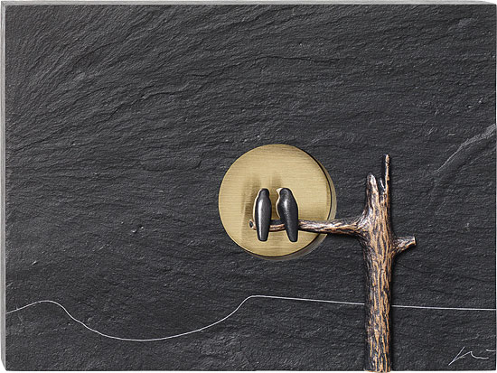 "Ett gammalt, redan dött träd framför den nedåtgående solen. I bakgrunden, endast antydd av en tunn linje, en rad kullar. Två korpar sitter tätt intill varandra, som om de vore uppslukade av en konversation. Vi kan bara spekulera om innehållet, kanske handlar det om vem som vann dagens fårhoppningstävling? Jag stöter på korpar eller andra kråkfåglar nästan varje dag på mina promenader. Jag kan hela tiden observera något nytt. De släpper ner valnötter på stigen från hög höjd eller kör över dem med fordon för att komma åt det goda innehållet så lätt som möjligt. Eller så utför de akrobatiska flygmanövrer för att jaga bort rovfåglar som plundrar deras revir. Eller så hoppar de runt på fåren som betar på våra åkrar på hösten. Det ser ut som om det pågår en tävling om vem som är fräckast och djärvast. Alla dessa observationer inspirerade mig till att skapa objektet "Rabengespräche"", säger Klaus Börner. Väggföremål av skiffer och brons. Catalogue raisonné nr 475, signerad av konstnären. Format 20 x 15 cm. Med upphängningsanordning.