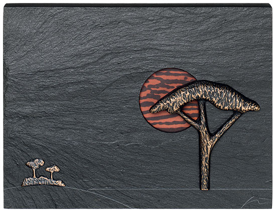 Klaus Börner samlar bara några få element i sitt omisskännliga bildobjekt - solen, ett träd och en avlägsen skog. Och ändå lyckas han med att exakt avbilda de karakteristiska dragen i ett landskap med minimalistisk charm. Den utbildade guldsmeden och skulptören bearbetar halvskulpturala element av patinerad brons till en fint strukturerad skifferplatta, vilket ger bildobjektet ett häpnadsväckande rumsligt djup och samtidigt fångar kvällsljuset från en fortskridande solnedgång på ett mycket imponerande sätt som en färgkomposition. Solens färgsättning är baserad på en ormskinnsjaspis från konstnärens samling. Väggobjekt av skiffer och brons. Unikt verk, signerat av konstnären. Storlek 20 x 15 cm. Vikt ca 2,5 kg. Med upphängningsanordning. Catalogue raisonné nr 450.