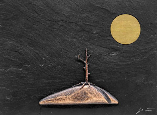 Väggobjekt av skiffer med brons och mässing. WVZ nr 494, varje objekt är unikt, signerat av konstnären. Storlek 15 x 20 cm (H/B). Med upphängningsanordning.