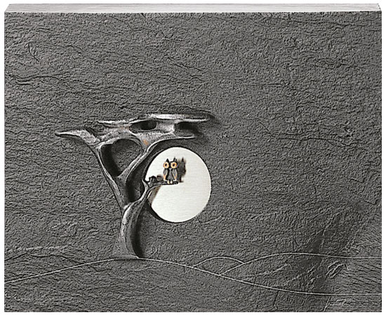Fullmånen skiner heligt runt den kikarögda ugglan på sin ensamma tall och ger konturerna av de mjuka kullarna ett magiskt, drömskt sken. Väggobjekt av skiffer, brons och stål. Catalogue raisonné nr 275, unik. Handsignerad av konstnären. Format 20 x 15 x 2,5 cm. Med upphängningsanordning.