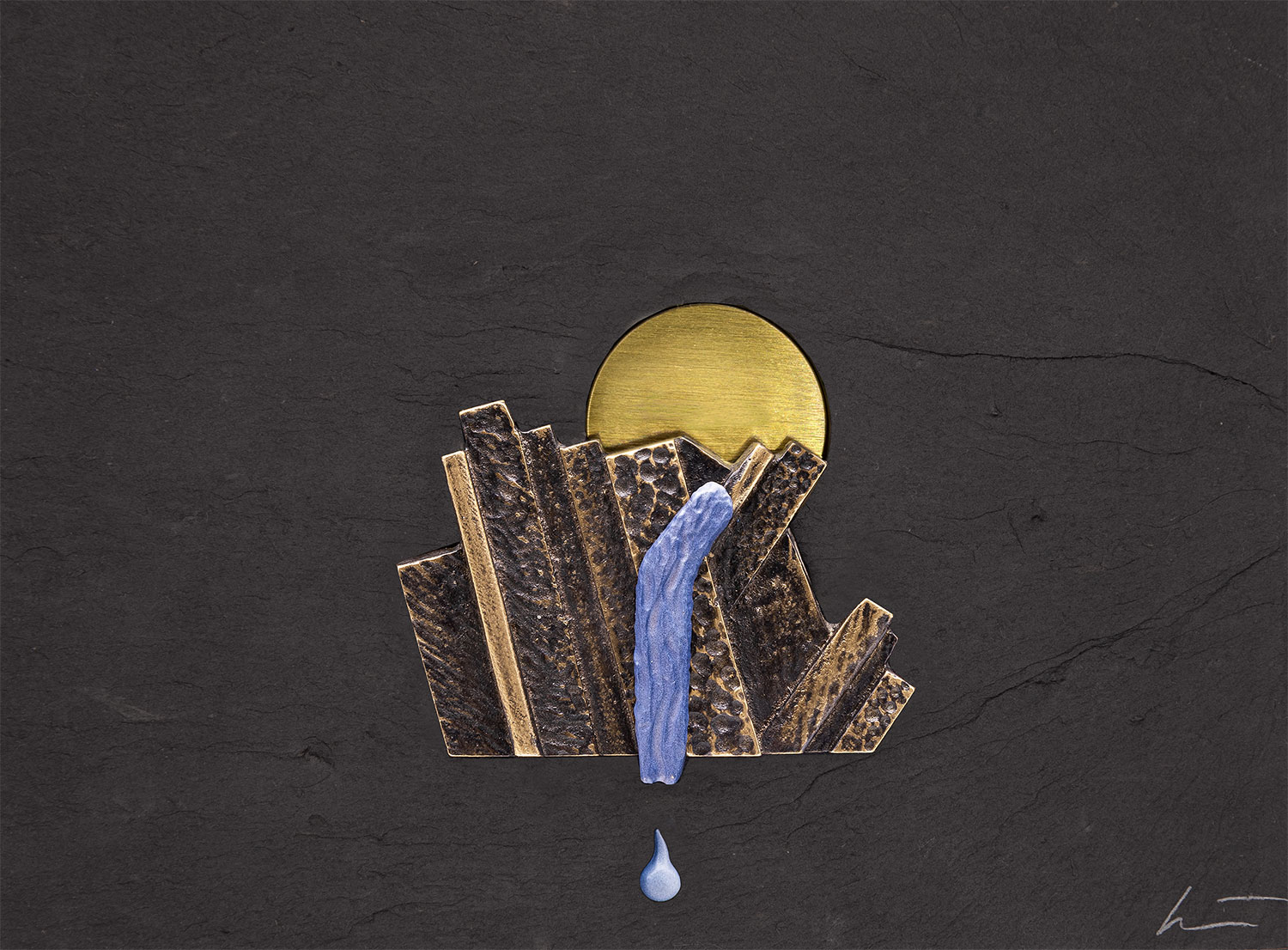 Väggobjekt av skiffer med brons och mässing, delvis infärgad. WVZ nr 492, varje objekt är unikt, signerat av konstnären. Storlek 15 x 20 cm (H/B). Med upphängningsanordning.