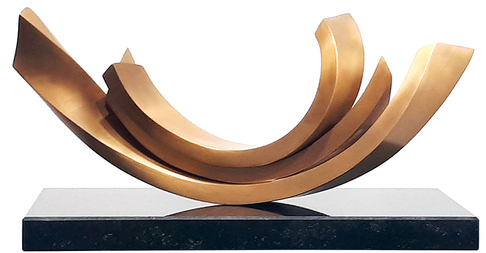 Denna fint balanserade skulptur tycks nästan sväva och utstrålar en fantastisk lätthet trots sina massiva bågar.skulptur i borstad brons. På en svart, polerad granitbas. Begränsad upplaga om 18 exemplar, numrerad och signerad. Skulpturens storlek 17 x 42 x 11 cm (H/W/D). Vikt ca 8 kg. Granitsockel storlek 2 x 25 x 15 cm (h/w/d). Vikt ca 5 kg.