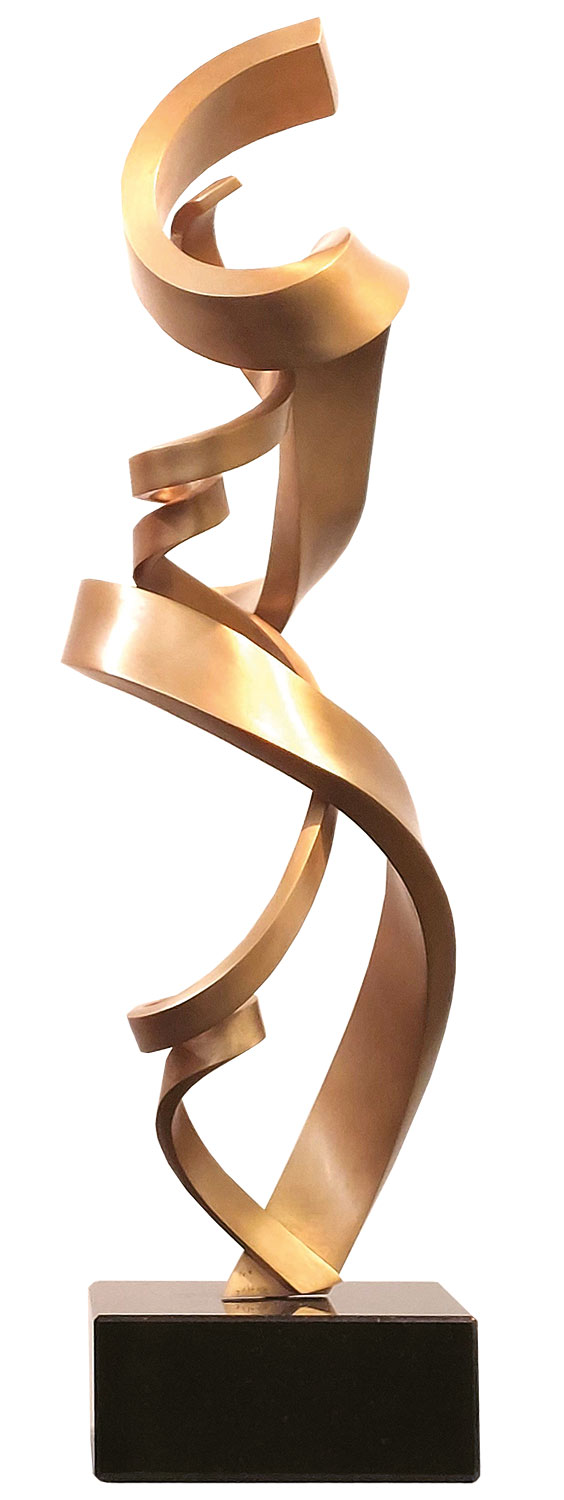 Kurvorna och spiralerna i den här skulpturen, som konstnären har format av remsor i olika bredder, utstrålar ohämmad energi. Den ser ut som en uppåtgående virvel som skulle kunna fortsätta i all evighet.skulptur i borstad brons. På en svart, polerad granitsockel. Begränsad upplaga om 18 exemplar, numrerad och signerad. Skulpturens storlek 65 x 20 x 20 cm (H/W/D). Vikt ca 9,9 kg. Granitsockel storlek 8 x 18 x 18 cm (h/w/d). Vikt ca 8,6 kg.